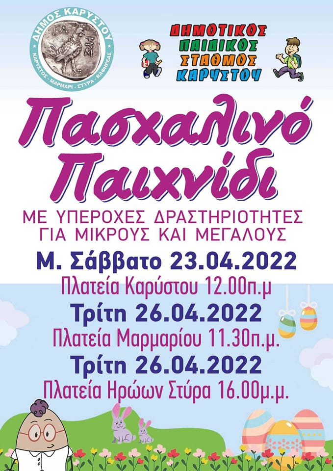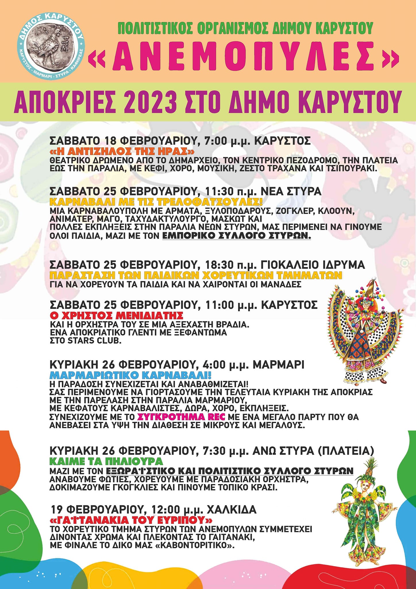 Μπορείτε να ενημερωθείτε για όλα τα Events στη σελίδα ΠΟΛΙΤΙΣΤΙΚΑ ΔΡΩΜΕΝΑ ΔΗΜΟΥ ΚΑΡΥΣΤΟΥ