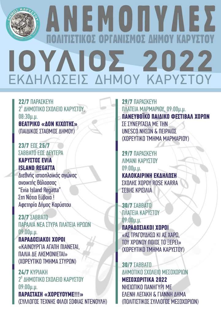 Από τον Πολιτιστικό Οργανισμό του Δήμου Καρύστου »Ανεμοπύλες», ανακοινώνεται το πρόγραμμα των εκδηλώσεων στο Δήμο Καρύστου για τον Ιούλιο 2022.