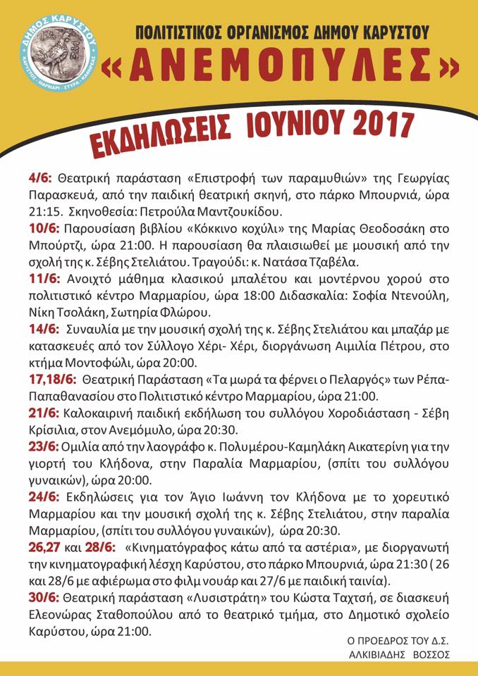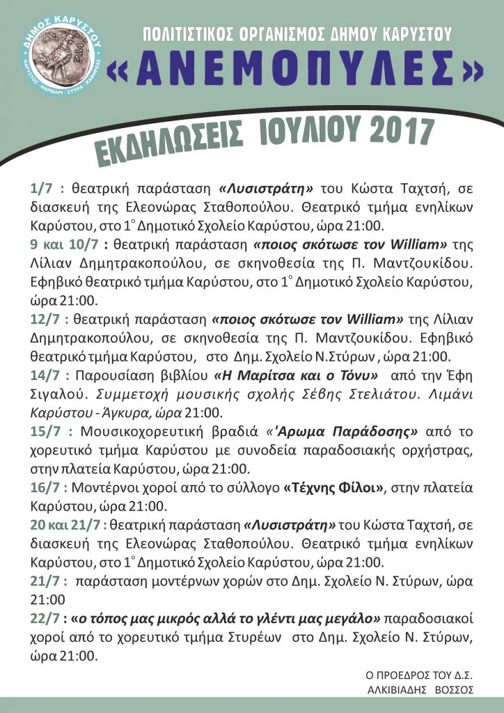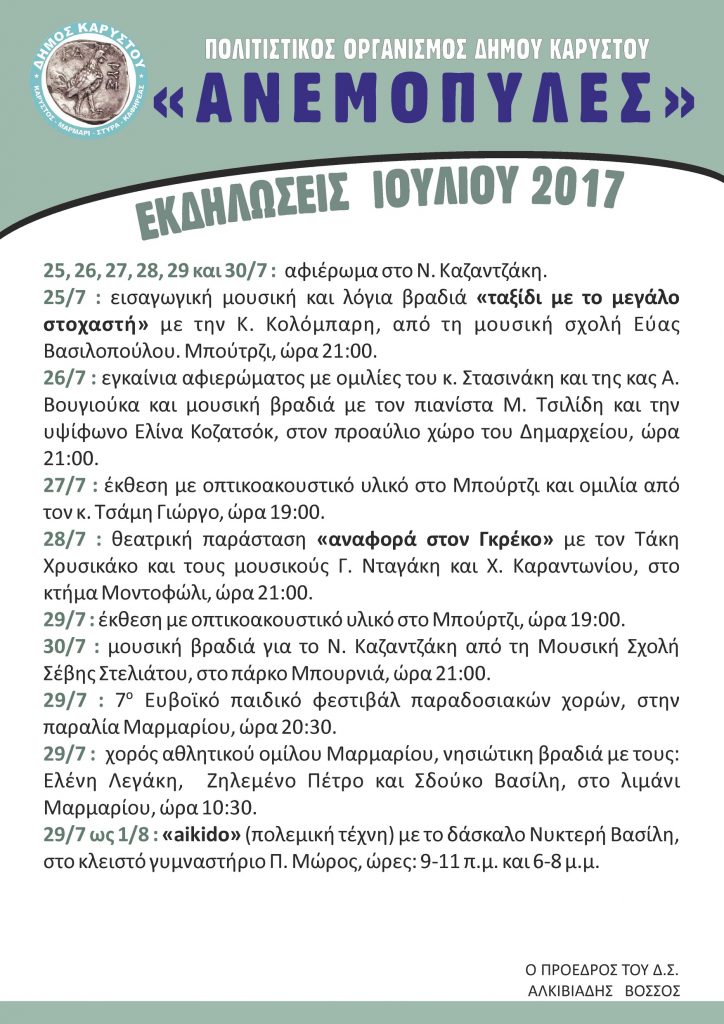 Την Κυριακή 25/7/2017 και ώρα 18:00 σας προσκαλούμε, στην αίθουσα εκδηλώσεων του Γυμνασίου – ΕΠΑ.Λ Καρύστου,
